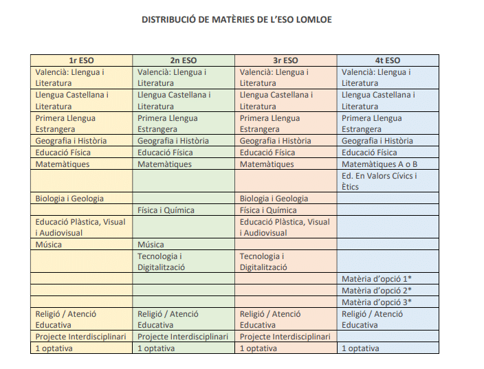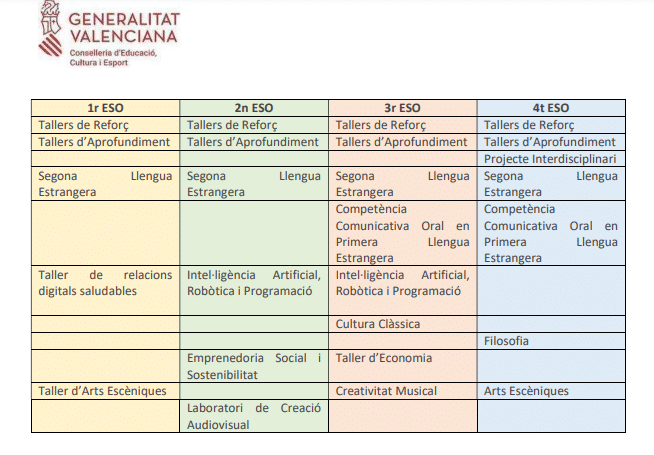 Hoy la administración educativa de la Comunidad Valenciana ha compartido con los centros el borrador del currículo de ESO LOMLOE. En esta primera tabla se observa la distribución de materias por cursos: