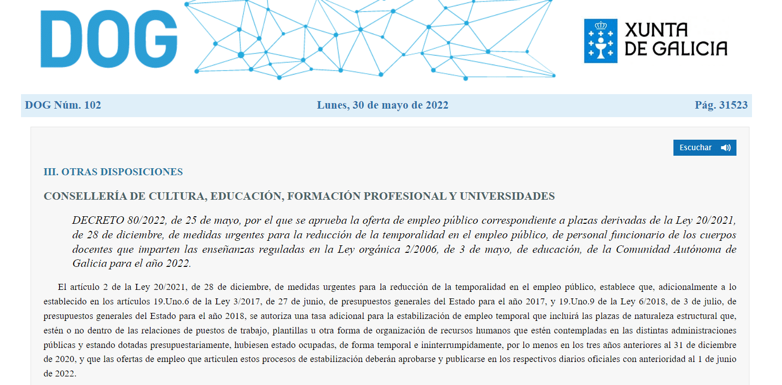 Galicia es de las CCAA con menor tasa de interinidad docente (convoca oposiciones todos los años). La media estatal de interinos docentes es del 25%, Galicia actualmente tiene el 8% y con estas plazas la situará por debajo del 6% en 2024 (el resto de CCAA tienen que bajar del 8% en 2024).