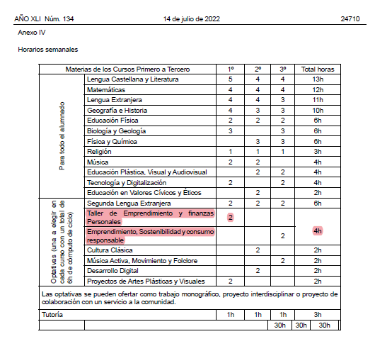 En el Decreto de la ESO vemos que el próximo curso se implantan las nuevas materias de Taller de Emprendimiento y finanzas personales (2 horas en 1º ESO) y Emprendimiento, Sostenibilidad y consumo responsable (2 horas en 3º ESO).