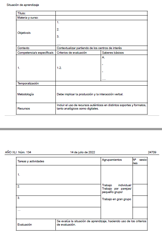 Y sacan un modelo de situación de aprendizaje mucho más sencillo y operativo que el de Andalucía (que se nota que está hecho por alguien que nunca ha dado clase. en ESO o bachillerato, porque es más difícil rellenarlo que descifrar un jeroglífico egipcio)