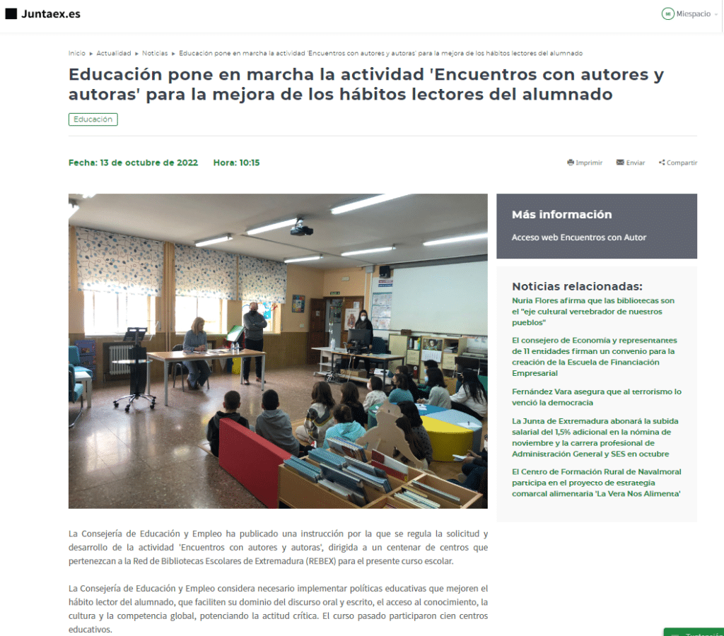 La Consejería de Educación y Empleo ha publicado una instrucción por la que se regula la solicitud y desarrollo de la actividad ‘Encuentros con autores y autoras’, dirigida a un centenar de centros que pertenezcan a la Red de Bibliotecas Escolares de Extremadura (REBEX) para el presente curso escolar. La Consejería de Educación y Empleo considera necesario implementar políticas educativas que mejoren el hábito lector del alumnado, que faciliten su dominio del discurso oral y escrito, el acceso al conocimiento, la cultura y la competencia global, potenciando la actitud crítica.