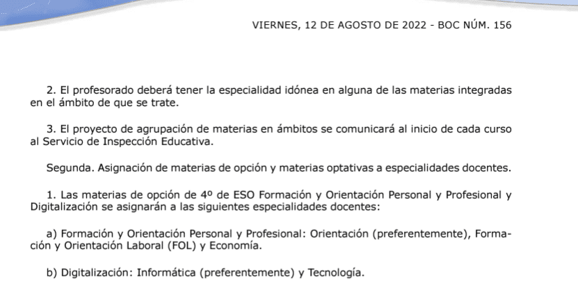 Sobre Economía, tenemos en la página 13, que tendrá prioridad en impartir la nueva materia ESO de Formación y Orientación Personal y Profesional