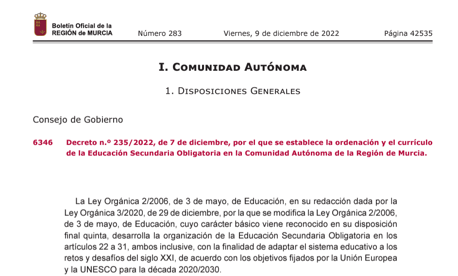 Hoy el BORM ha publicado el Decreto ESO LOMLOE para la Comunidad de Murcia.