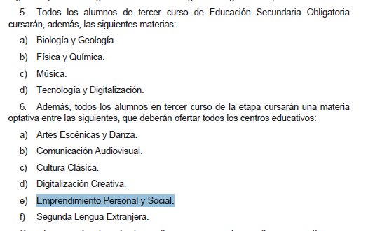 En 3º ESO aparece la optativa Emprendimiento Personal y Social (2 horas lectivas), que compite con otras 5 para elegir una.