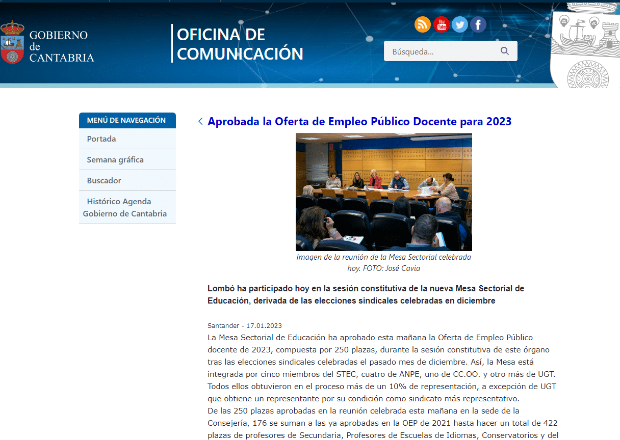 Ayer hubo mesa sectorial en Cantabria y se aprobó la Oferta de Empleo Público docente de 2023, que se ejecutará en 2024.