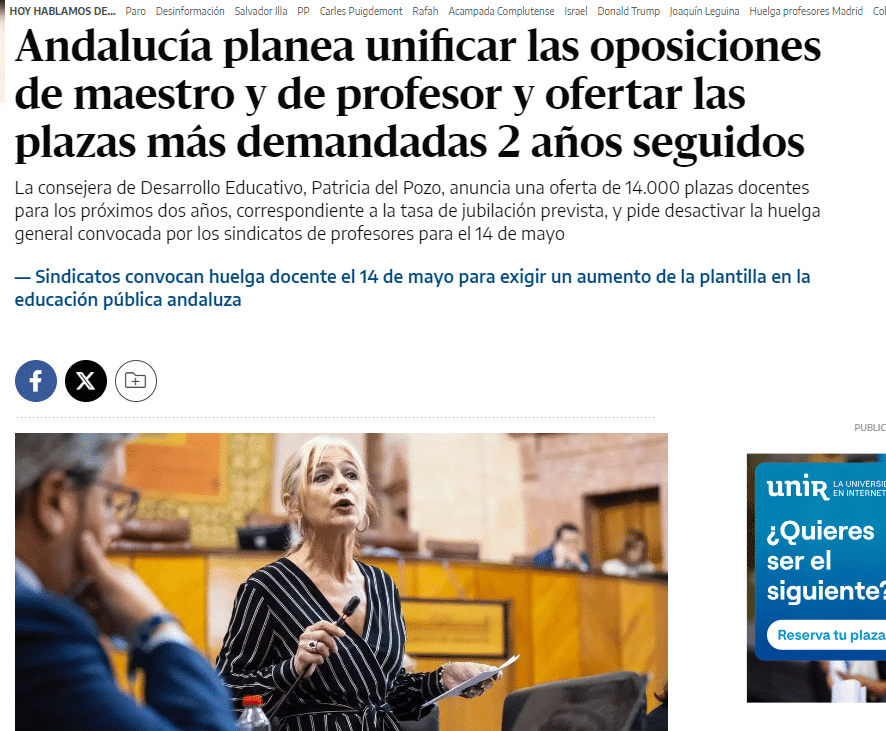 El Gobierno Andaluz ha anunciado 14.000 plazas de oposiciones entre 2025 y 2026. Además, pretenden a partir de 2027 dar más estabilidad a las convocatorias, ofertando aquellas especialidades más demandadas varios años consecutivos y garantizando que en ninguna especialidad pasen más de 3 años sin convocatoria. Esto son grandes noticias para los opositores, que podrán planificar su estudio a medio y largo plazo, reduciendo la angustiosa incertidumbre reinante en los últimos años.