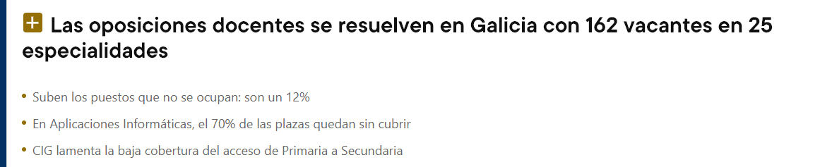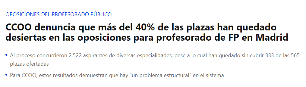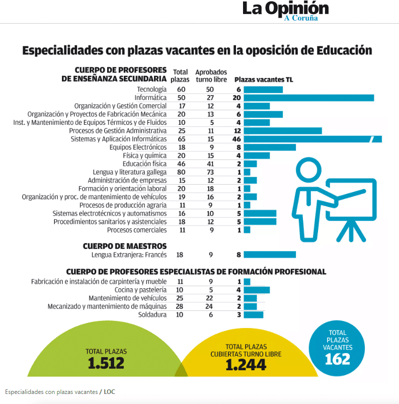 Pero es una tónica en muchas CCAA, así en Galicia el % total de plazas desiertas en secundaria y FP es del 16% y en algunas especialidades llega al 70%.