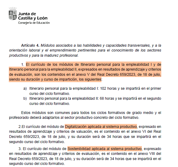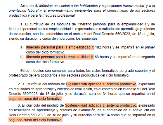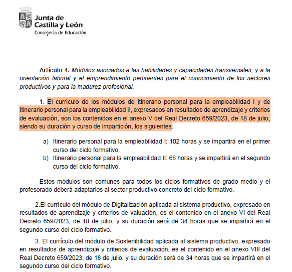 - Remibe al BOE para el currículo de IPE I (Itinerario personal para la empleabilidad I) , IPE II, Digitalización y Sostenibilidad (estas dos últimas las pone en el segundo curso).