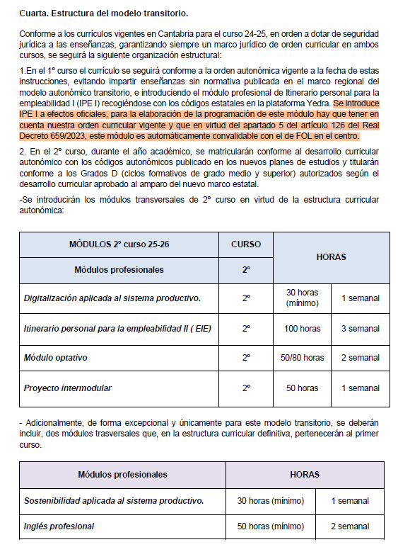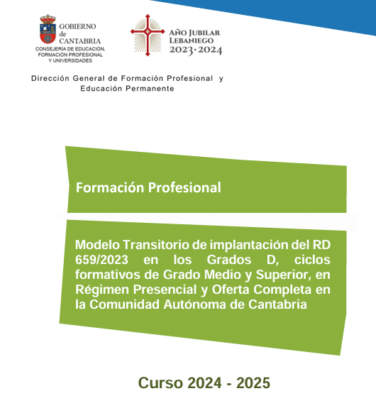 Modelo Transitorio de implantación del RD 659/2023 en los Grados D, ciclos formativos de Grado Medio y Superior, en Régimen Presencial y Oferta Completa en la Comunidad Autónoma de Cantabria