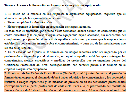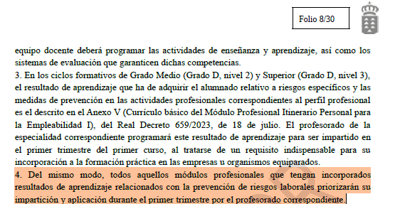 - Módulo de Prevención y Salud Laboral en primer curso de grado básico.