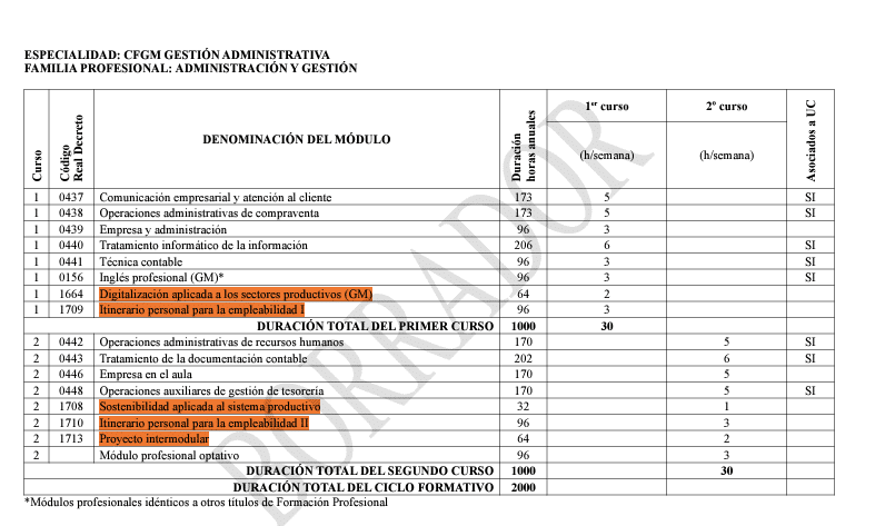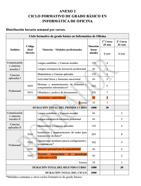 - Prevención y salud laboral (33 horas, 1 hora semanal en primer curso).