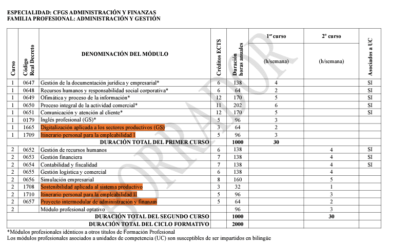 - Itinerario personal para la empleabilidad (66 horas, 2 semanales en segundo curso).