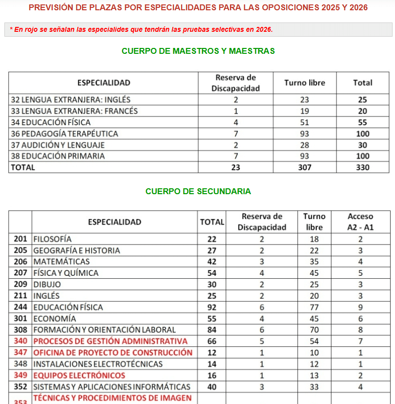 Estamos ante una gran convocatoria, anunciada a menos de 4 meses del inicio de las pruebas en el caso de las especialidades a convocar este 2025, por lo que los opositores bien preparados tienen muchas posibilidades. Encontramos en 2025 un total de 55 plazas para Economía, 84 para FOL, 57 para ADE, 15 para OGC y 30 para PC. En 2026 habrá 66 plazas para PGA.