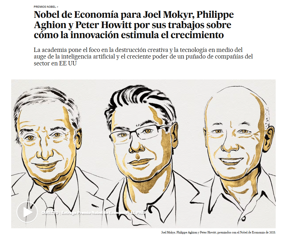Ayer la Real Academia Sueca de Ciencias otorgó el Premio del Banco de Suecia en Ciencias Económicas 2025 por un lado a Joel Mokyr y por otro a Philippe Aghion y Peter Howitt, por haber explicado sus teorías sobre «el crecimiento económico impulsado por la innovación». Como curiosidad, recordemos que el conocido como Nobel de Economía no es un Premio Nobel en sí, dado que no fue contemplado por Alfred Nobel en 1901, cuando creó los galardones en Física, Química, Medicina, Literatura y Paz. El de Ciencias Económicas lo creó posteriormente el Banco de Suecia, en 1968, en memoria de Alfred Nobel. El importe económico para los laureados es el mismo que para el resto de «Nobeles»: casi un millón de euros.
