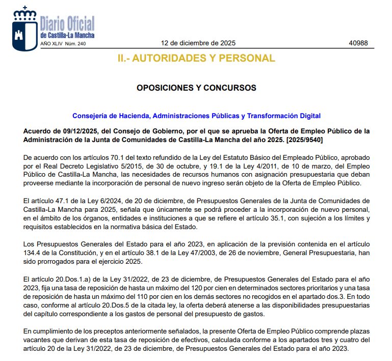 Castilla la Mancha ha publicado su Oferta de Empleo Público de 2025, detallando las plazas por especialidad. Esto es muy interesante, dado que la mayoría de comunidades al formalizar la OPE no desglosa por especialidades, tan solo indica el número total de plazas por cuerpos, lo que da poca información. Recordemos que la aprobación de la OPE es el paso previo al de la convocatoria de las oposiciones. En este caso, estas plazas se aprueban ahora en OPE para ser convocadas en el caso del cuerpo de profesores de secundaria en 2027. La convocatoria debe salir antes del 30 de abril de 2027.