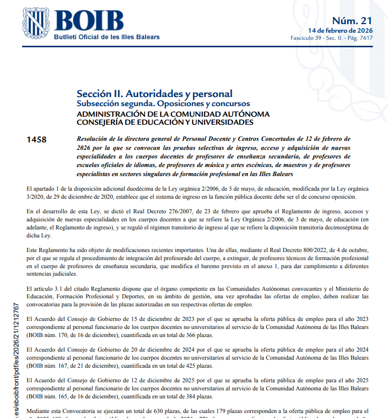 La semana pasada informábamos de que ya teníamos fecha de inicio para las pruebas en las oposiciones de secundaria de este 2026 en Baleares (9 y 10 de mayo). Ya tenemos la convocatoria publicada.